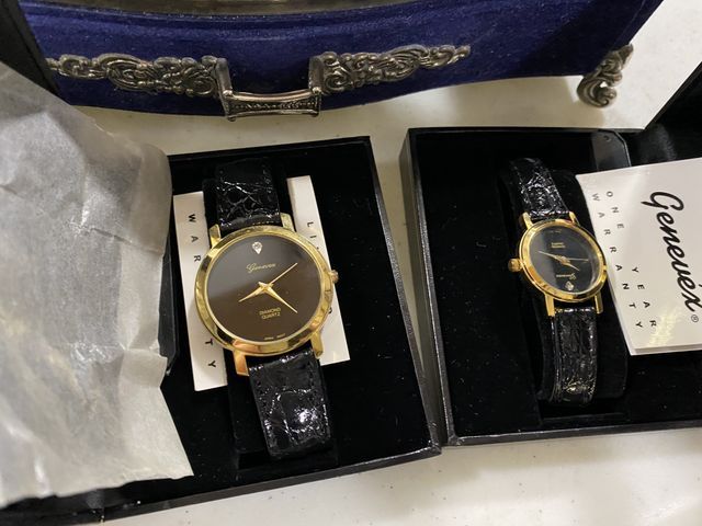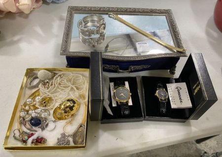 Box of costume earrings, necklaces, pendants, two Geneuex watches, ladies watch, bracelet, mirrored ornate jewelry box. Box of costume earrings, necklaces, pendants, two Geneuex watches, ladies watch, bracelet, mirrored ornate jewelry box.