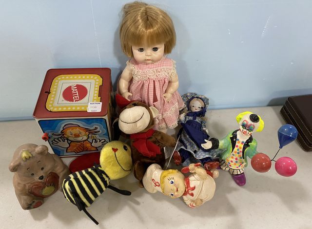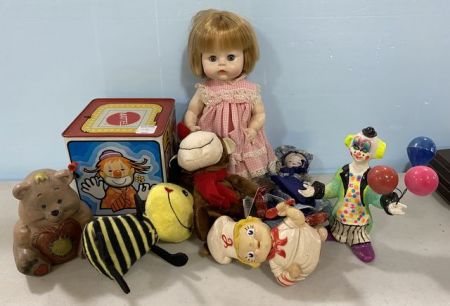 Vintage Jack in the box, ceramic clown, porcelain girl doll, bear, small doll. Vintage Jack in the box, ceramic clown, porcelain girl doll, bear, small doll.