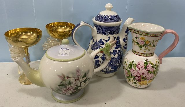 Pottery Pitchers, Churchill, Laura Ashley, Lena Hummingbird, and Leonard Gold Plate Stems Pottery Pitchers, Churchill, Laura Ashley, Lena Hummingbird, and Leonard Gold Plate Stems