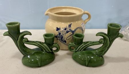 1083 Carey Pottery Stoneware Pitcher, Pair of Green McCoy Candle Sticks