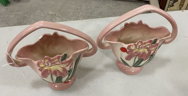 Pair of Hull Pottery Basket Vases, USA, hand painted, one has a rim chip, 10"h. Pair of Hull Pottery Basket Vases, USA, hand painted, one has a rim chip, 10"h.