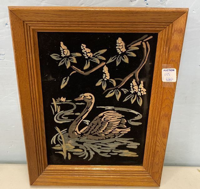 Swan Painted Felt art, wood framed, 14"h., 11"w. Swan Painted Felt art, wood framed, 14"h., 11"w.