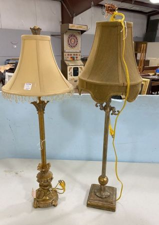 Two Gold Buffet Lamps, metal frames, different styles, with shades, 30"h. Two Gold Buffet Lamps, metal frames, different styles, with shades, 30"h.