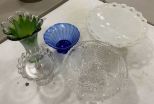Collection of Art and Clear Glassware, art glass vase, blue glass bowl, pressed glass compote, footed bowl, milk glass compote. Collection of Art and Clear Glassware, art glass vase, blue glass bowl, pressed glass compote, footed bowl, milk glass compote.