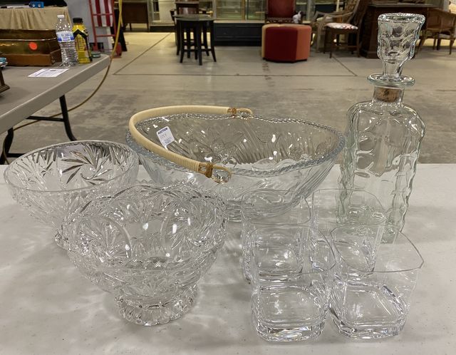 Hobstar Pressed Glass Bowls, Large Glass Bowl with Handled, Decanter, and Glass Hobstar Pressed Glass Bowls, Large Glass Bowl with Handled, Decanter, and Glass