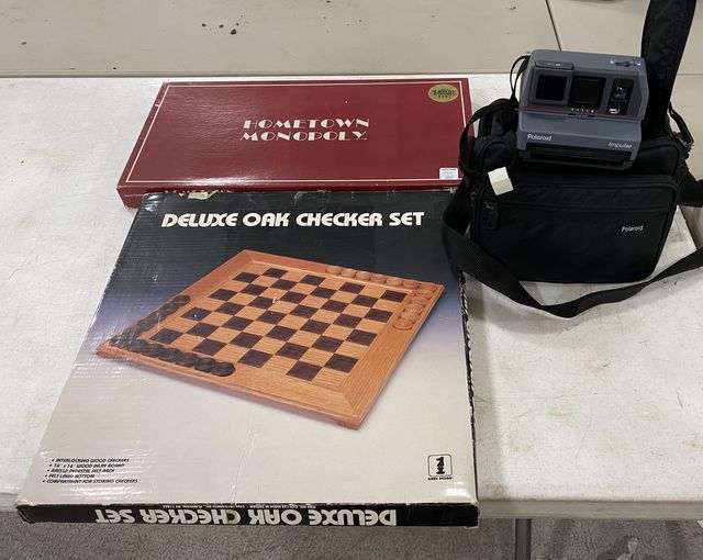 1227 Hometown Monopoly, Deluxe Oak Checker Set and Polaroid Impulse Camera
