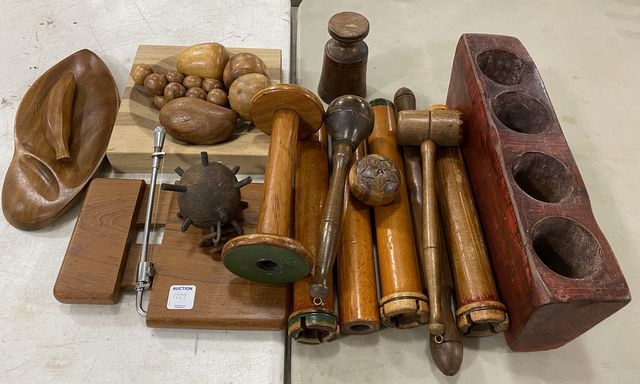 1229 Group of Primitive Spools, Carved Candle Holder, Fruit, and Cutter