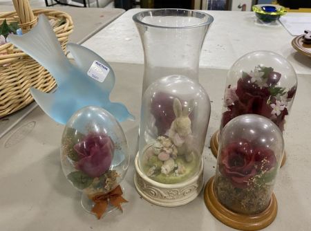 1254 Glass Flower Domes, Rabbit, Vase, and Glass Blue Bird