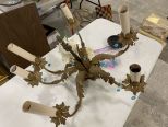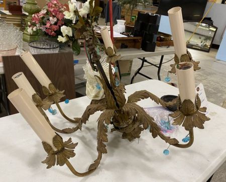 Metal Ornate 6 Arm Chandelier, blue glass prisms, 21"dia. Metal Ornate 6 Arm Chandelier, blue glass prisms, 21"dia.