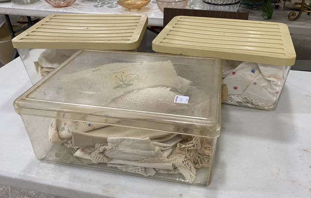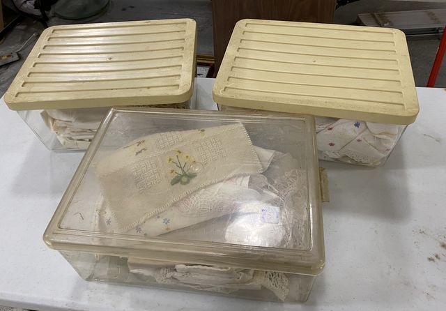 Three Crate of Vintage Linens and Crochets, need cleaning. Three Crate of Vintage Linens and Crochets, need cleaning.