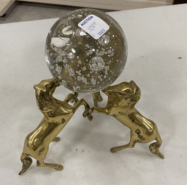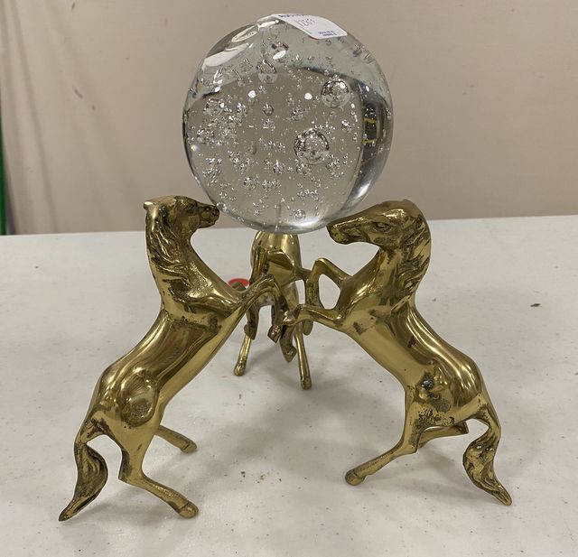 Brass horse decorative stand with ball, 8"h. Brass horse decorative stand with ball, 8"h.