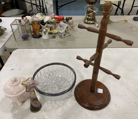 1290 Art Glass Vase, Milk Glass Jar, Silver Plate Rim Bowl, and Wood Stand