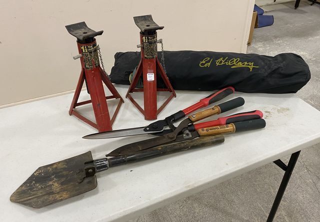 1 1/2 Ton Jack Stands, Hedge Shears, Shovel, and Tent 1 1/2 Ton Jack Stands, Hedge Shears, Shovel, and Tent