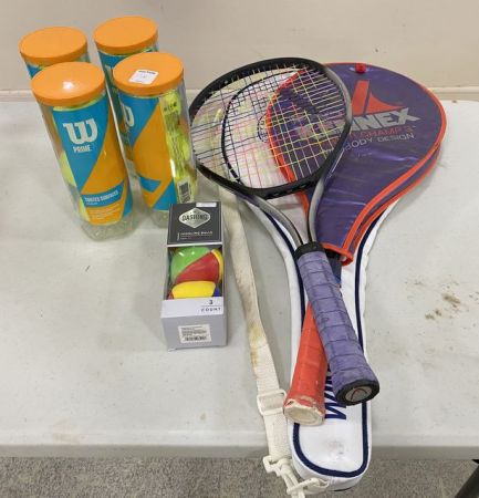 Three Tennis Racks, Three Packs of Balls, and Juggling Balls. Three Tennis Racks, Three Packs of Balls, and Juggling Balls.