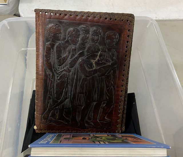 Red note pad booklets, antique leather book case, and other books. Red note pad booklets, antique leather book case, and other books.