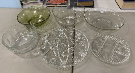 Glass serving bowls, salad bowls, pressed glass under plate, divided plates. Glass serving bowls, salad bowls, pressed glass under plate, divided plates.