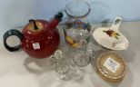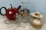 Apple coffee pot, juice glass, gravy, small plates, cruets. Apple coffee pot, juice glass, gravy, small plates, cruets.