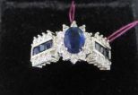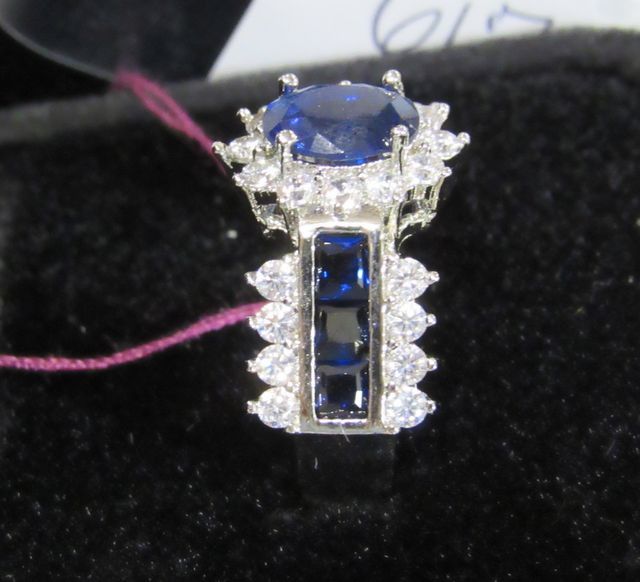 The band is partially set with clear and blue stones. In a silvertone setting. Size 8. The band is partially set with clear and blue stones. In a silvertone setting. Size 8.