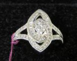 619 Four Small Round Clear Stones Surrounded by a Halo of Baguette and Round Shaped Stones with a Partially Set Band of Clear Stones