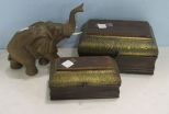651 Two Wooden Boxes with Palms and Elephant Decorations and a Carved Wooden Elephant Figure