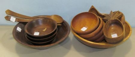 757 Billings, Missouri Burled Walnut Bowl and Three Smaller Bowls with a Wooden Bowl and Matching Six Wooden Bowls, Salad Utensils, Pineapple Hors d'oeuvre Dish and Bowl