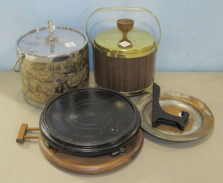 758 Two Ice Buckets, A Copper Plate, A Stand, A Wood and Tile Trivet, and a Plate Stand