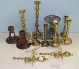 Includes two wooden candlesticks, 5" high. Also seven brass candlesticks the tallest is 12" high. a pewter candlestick, and two brass wall sconces. Includes two wooden candlesticks, 5" high. Also seven brass candlesticks the tallest is 12" high. a pewter candlestick, and two brass wall sconces.