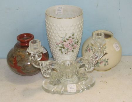 760 Hand Crafted Pottery Vase, a Lenox Global Serenade Vase, a Lefton China Vase and a Double Light Crystal Candlestick