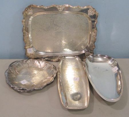 965 Two Mid Century Style Silver Plate Trays by W & S Blackinton and Sons and a Blackinton Food Tray, "Victoria", and a Wilcox Lily Pad Dish