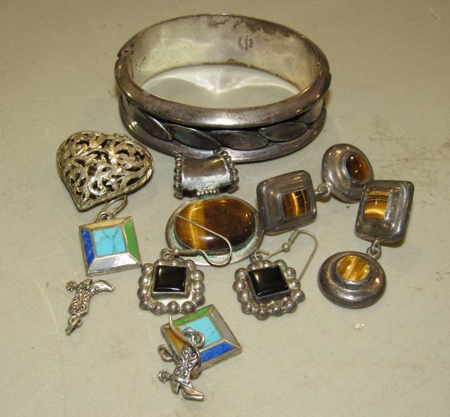 Includes a Mexican sterling silver clapper bracelet, a sterling silver and tiger eye slide and earrings. multi stone inlay earrings, onyx earrings, a heart pendant and two cowboy boots. Includes a Mexican sterling silver clapper bracelet, a sterling silver and tiger eye slide and earrings. multi stone inlay earrings, onyx earrings, a heart pendant and two cowboy boots.