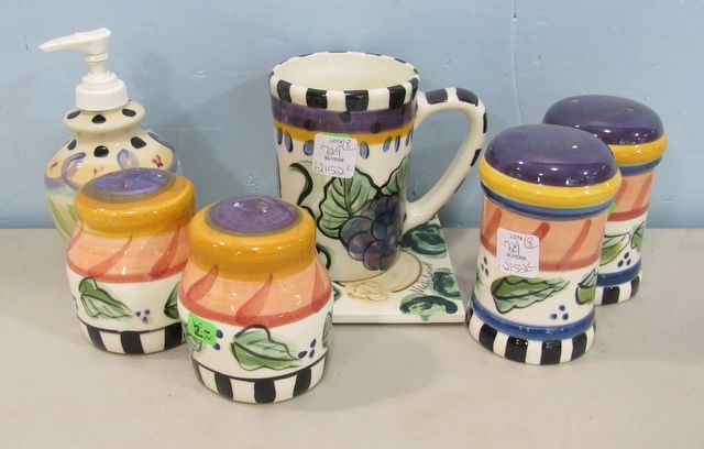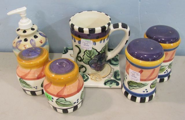 729 Vicki Carrol Ceramic Platter with Two Sets of Salt and Pepper Shakers, Soap Dispenser and a Mug and Trivet
