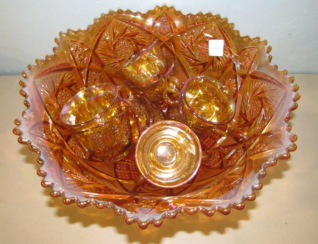 413 Imperial Carnival Glass Whirling Start Punch Bowl with Saw Tooth Edge and Ten Grape Marigold Punch Cups