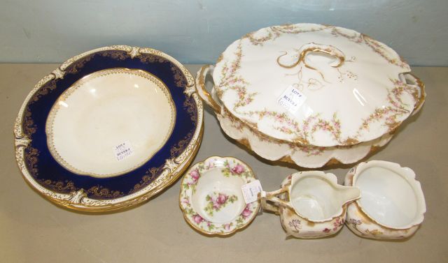 733 Theodore Haviland Tureen, T & V Creamer, Sugar and Finger Bowl, and Four Cobalt and Gilt Gumbo Bowls