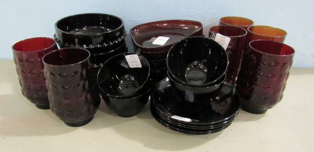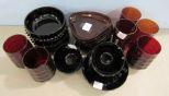 Includes seven Hazel-Atlas Moderntone red dishes. Three hobnail style tumblers, three high balls, and four black glass cups and saucers in Moderntone. Also, four English black glass hobnail style bowls. May have chips. Includes seven Hazel-Atlas Moderntone red dishes. Three hobnail style tumblers, three high balls, and four black glass cups and saucers in Moderntone. Also, four English black glass hobnail style bowls. May have chips.