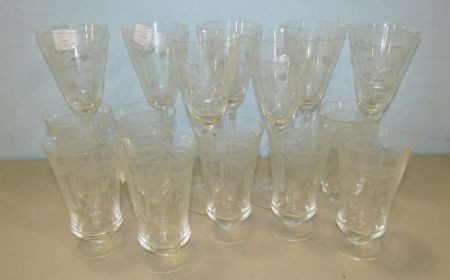 794 Eight Etched Low Stems and Seven Tall Wine Stems
