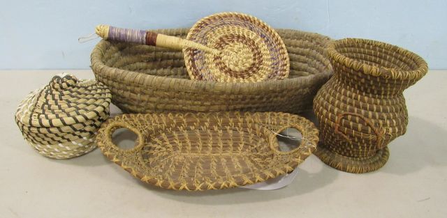 656 Oval Sweet Grass Basket, Two Pine Needle Baskets, a Sweet Grass Basket with Vinyl Weave, and a Sweet Grass Hand Held Fan