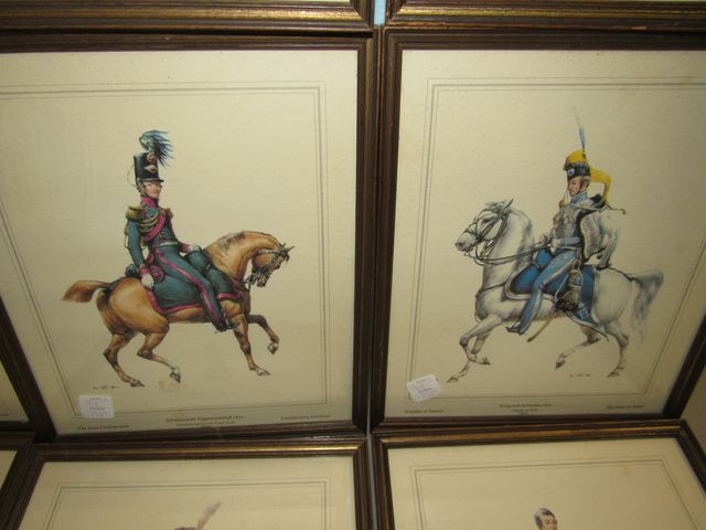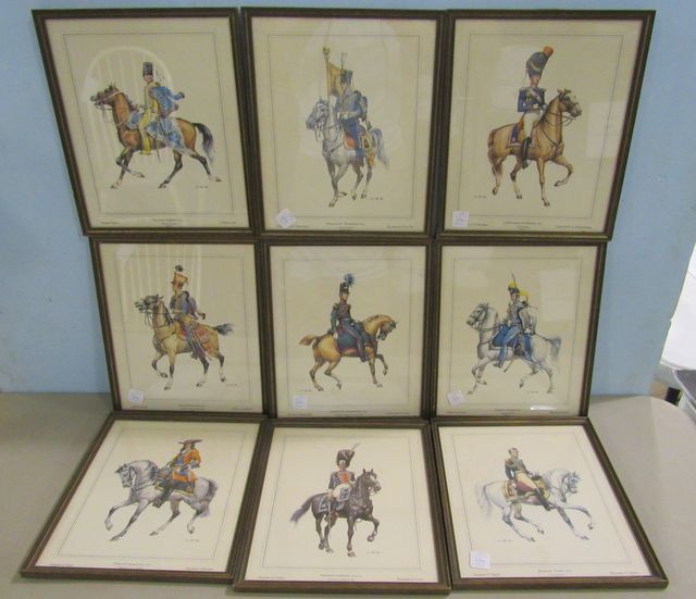 918 Nine Framed Prints of Soldiers on Horseback in Different Uniforms from the 19th Century