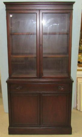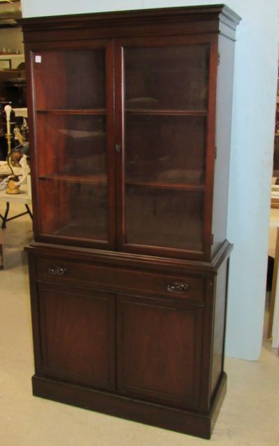 Has two upper glass doors and two interior wooden shelves. The bottom has a drawer and double doors. Has two upper glass doors and two interior wooden shelves. The bottom has a drawer and double doors.