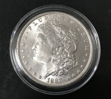 1888 Silver Morgan Dollar, fine condition, with plastic case. Philadelphia mint 1888 Silver Morgan Dollar, fine condition, with plastic case. Philadelphia mint