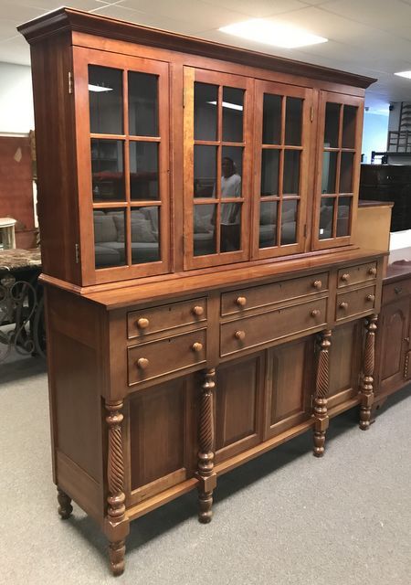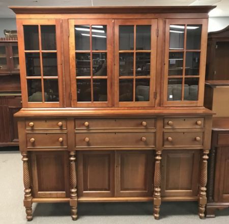 Cassady Furniture Company Cherry Reproduction China Cabinet, two piece, beautiful piece, turned scroll legs, 6 drawers, quad door, four glass top doors, two shelves, Kentucky Piece, 80"h., 72"w., 21"d, has light sun fade on one side. Cassady Furniture Company Cherry Reproduction China Cabinet, two piece, beautiful piece, turned scroll legs, 6 drawers, quad door, four glass top doors, two shelves, Kentucky Piece, 80"h., 72"w., 21"d, has light sun fade on one side.
