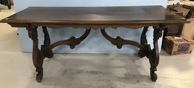 Antique Country French Dining Table, double pedestal, carved base, some age wear, 32"h., 80"w, 32"d. Antique Country French Dining Table, double pedestal, carved base, some age wear, 32"h., 80"w, 32"d.