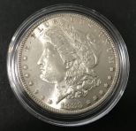 1883 Silver Morgan Dollar, fine condition, with plastic case. Philadelphia mint 1883 Silver Morgan Dollar, fine condition, with plastic case. Philadelphia mint