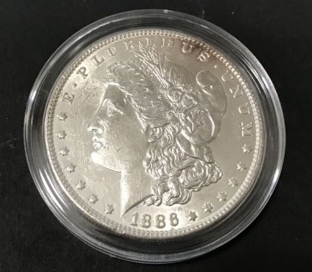1886 Silver Morgan Dollar, vg/ fine condition, with plastic case. Philadelphia mint 1886 Silver Morgan Dollar, vg/ fine condition, with plastic case. Philadelphia mint