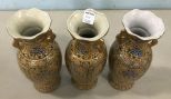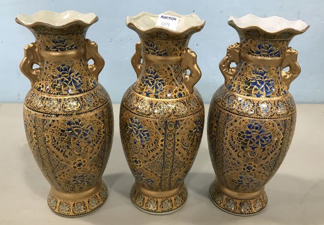 Three gold painted beaded oriental vases, porcelain, crimped rim, good condition, 10"h. Three gold painted beaded oriental vases, porcelain, crimped rim, good condition, 10"h.