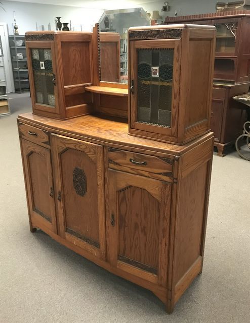 Vintage Unique oak buffet, Center beveled mirror, two side cases with stained leaded glass doors, three doors, two drawers, has light age wear, 69"h., 18"w., 55"d. Vintage Unique oak buffet, Center beveled mirror, two side cases with stained leaded glass doors, three doors, two drawers, has light age wear, 69"h., 18"w., 55"d.