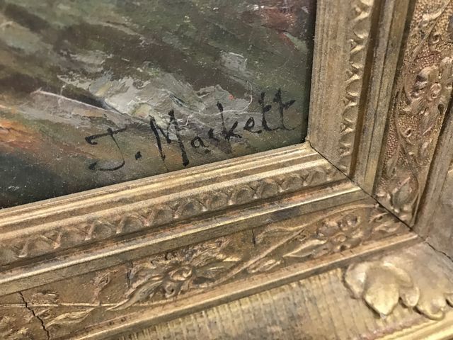 20th Century Oil Painting "The Landing" by J. Maskell, English Artist, on canvas, signed lower right, gold gilt framed, retail 1450.00, has several small chips on canvas, 33"h 45"w. 20th Century Oil Painting "The Landing" by J. Maskell, English Artist, on canvas, signed lower right, gold gilt framed, retail 1450.00, has several small chips on canvas, 33"h 45"w.