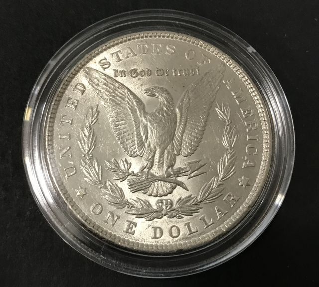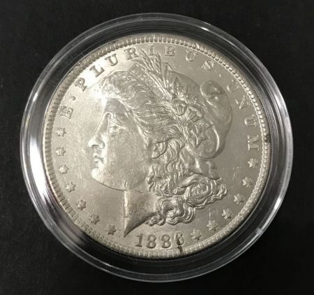 1886 Silver Morgan Dollar, very good condition, with plastic case. Philadelphia Mint. 1886 Silver Morgan Dollar, very good condition, with plastic case. Philadelphia Mint.