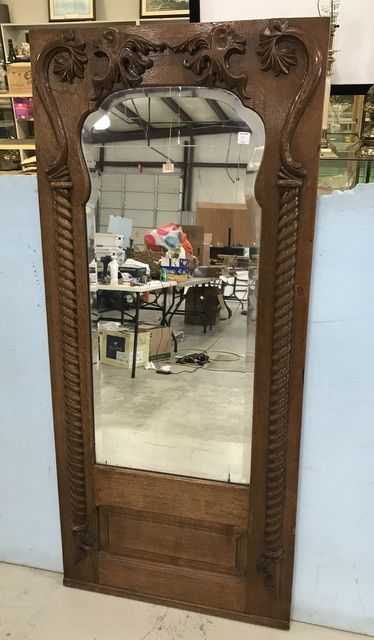 Antique oak wall hanging mirror panel, converted from wardrobe door, beveled mirror, carved motif, 61"h., 27"w. Antique oak wall hanging mirror panel, converted from wardrobe door, beveled mirror, carved motif, 61"h., 27"w.