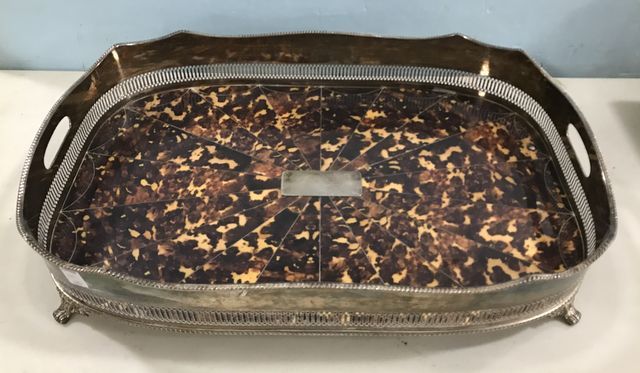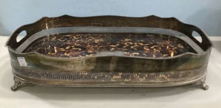 Silver Plated Footed Serving Tray, tortoise style bottom with silver plate name plate, no monogram, light tarnish, 5 1/2"h., 24"w. Silver Plated Footed Serving Tray, tortoise style bottom with silver plate name plate, no monogram, light tarnish, 5 1/2"h., 24"w.
