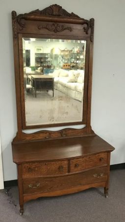 Vintage Oak Low dresser with mirror, carved wood crest, two drawers, on casters, beveled mirror, 86"h., 44"w., 21"d. Vintage Oak Low dresser with mirror, carved wood crest, two drawers, on casters, beveled mirror, 86"h., 44"w., 21"d.